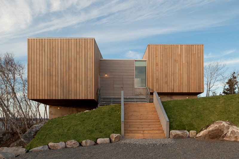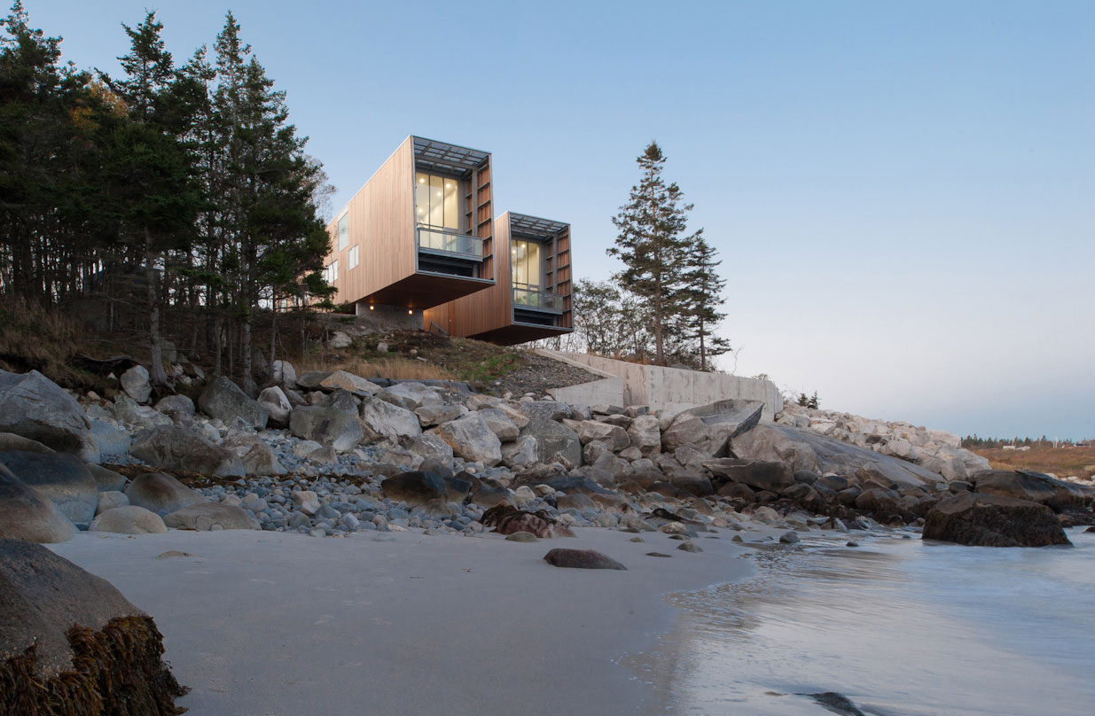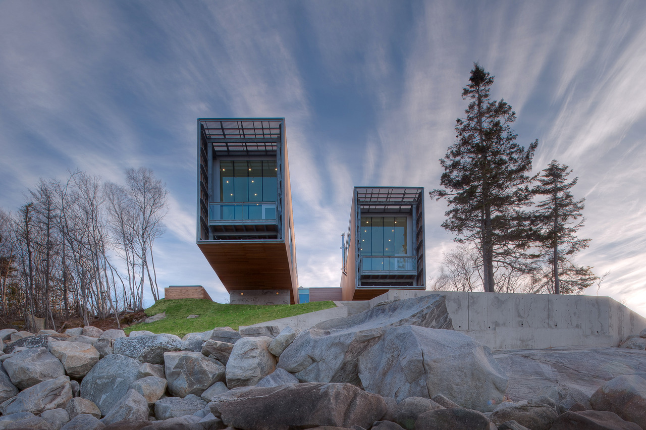 This project is situated in a glaciated, coastal landscape, with a cool maritime climate. The geomorphology of the site consists of granite bedrock and boulder till, creating pristine white sand beaches, and turquoise waters. The two pavilions float above the shoreline like two ship's hulls up on cradles for the winter, forming protected outdoor places both between and under them.