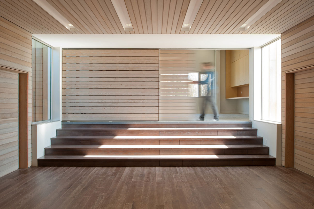 This is a landscape-viewing instrument; like a pair of binoculars, first looking out to sea. A third transverse 'eye' looks down the coastline, and forms a linking entry piece. This is a steel frame house, with a wood skin. Its white, steel endoskeleton resists both gravity loads and wind uplift. The 32' cantilevers and concrete fin foundations invite the sea to pass under without damage.